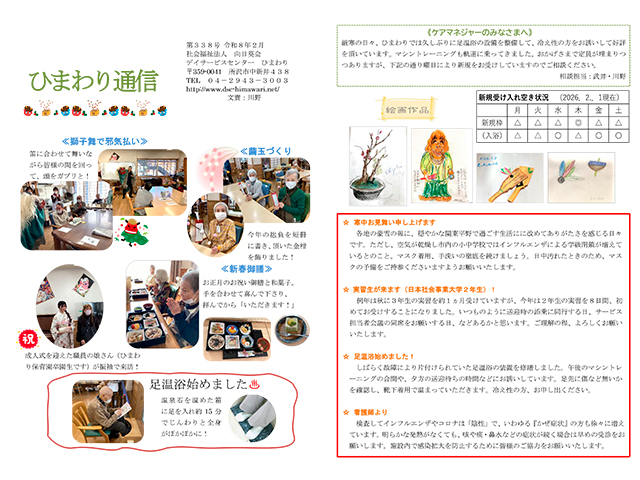 今年は、ひまわり開設から28年目に入ります。人材不足に悩みながらも、職員一同、利用者の皆さまが穏やかに健やかに、充実した時間をお過ごし頂けるよう力を合わせて取り組んで参ります。新規のご利用者ご紹介待ちしております。来年もどうぞよろしくお願いいたします!