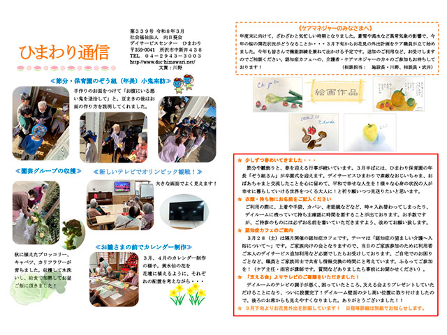 年度末に向けて、ざわざわと気忙しい時期となりました。豪雪や渇水など異常気象の影響で、今年の桜の開花状況がどうなることか・・・3月下旬からお花見の外出計画をケア職員が立て始めました。今年も皆さんで機能訓練を兼ねて出かける予定です。追加のご利用など、お受けしますのでご相談ください。認知症カフェへの、介護者・ケアマネジャーの方々のご参加もお待ちしております!