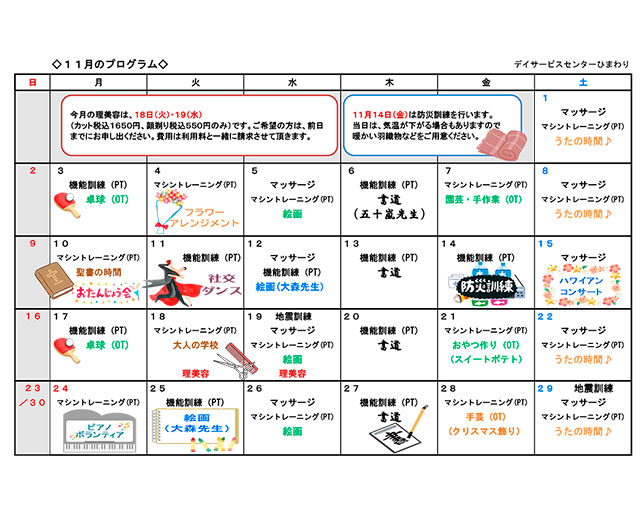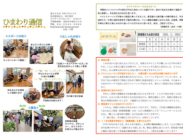季節性インフルエンザの流行が早めに始まっている様子です。改めて気を引き締めて感染予防に留意し、冬を迎えなければと思います。マシントレーニングが徐々に軌道に乗ってきました。要支援から要介護への移行期など、半日通所から一日型に通所先変更をご検討の際には、マシン運動を継続しながら入浴、お食事、季節行事など新たに楽しみながら通っていただけるかと思います。是非、ご紹介ください。
