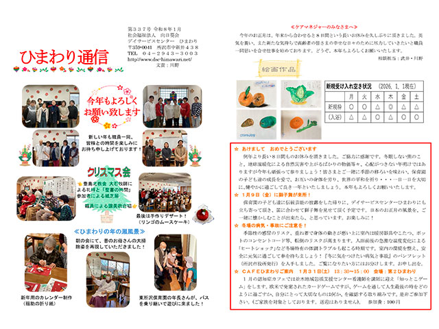 今年は、ひまわり開設から28年目に入ります。人材不足に悩みながらも、職員一同、利用者の皆さまが穏やかに健やかに、充実した時間をお過ごし頂けるよう力を合わせて取り組んで参ります。新規のご利用者ご紹介待ちしております。来年もどうぞよろしくお願いいたします!