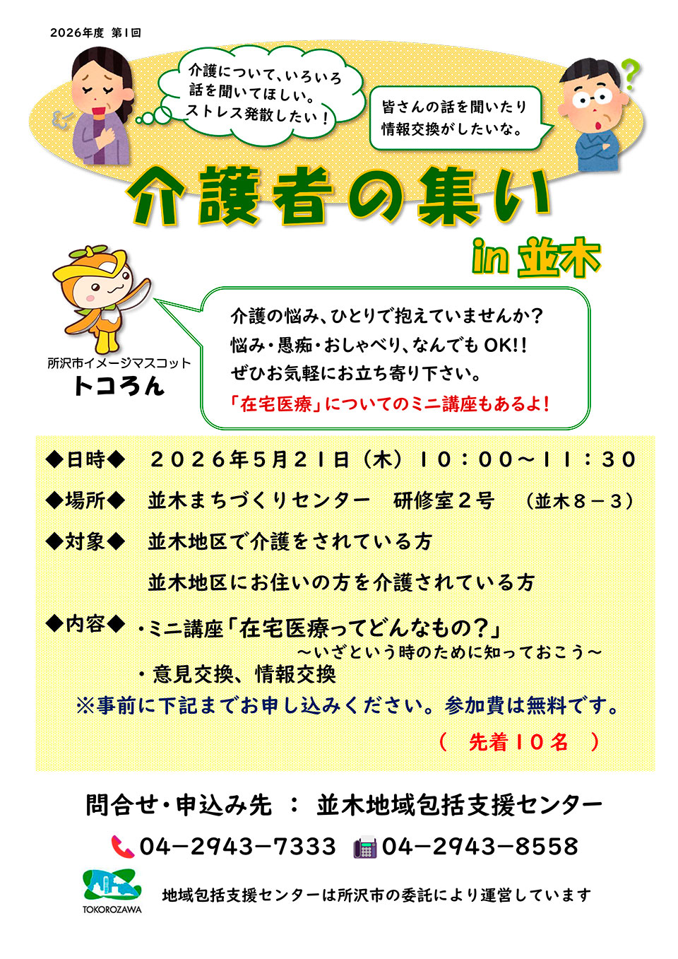 「地域包括支援センター」は高齢者の方が住みなれた地域で安心して暮らしていけるように、介護・福祉・健康・医療など、さまざまな面から高齢者の方やその家族を支える公的な機関です。所沢市では社会福祉法人等に委託し、市内14ヶ所に地域包括支援センターを設置しています。本人・家族・地域住民・ケアマネージャーなどから受けたいろいろな相談ごとを、適切な機関と協力しながら支援します。まずはお電話でお気軽にご連絡下さい。